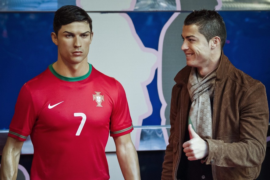 Cristiano Ronaldo, jogador do Real Madri, sorri diante da sua escultura no Museu de Cera, que foi apresentada neste sábado (7)Crédito: Emilio Naranjo/EFE